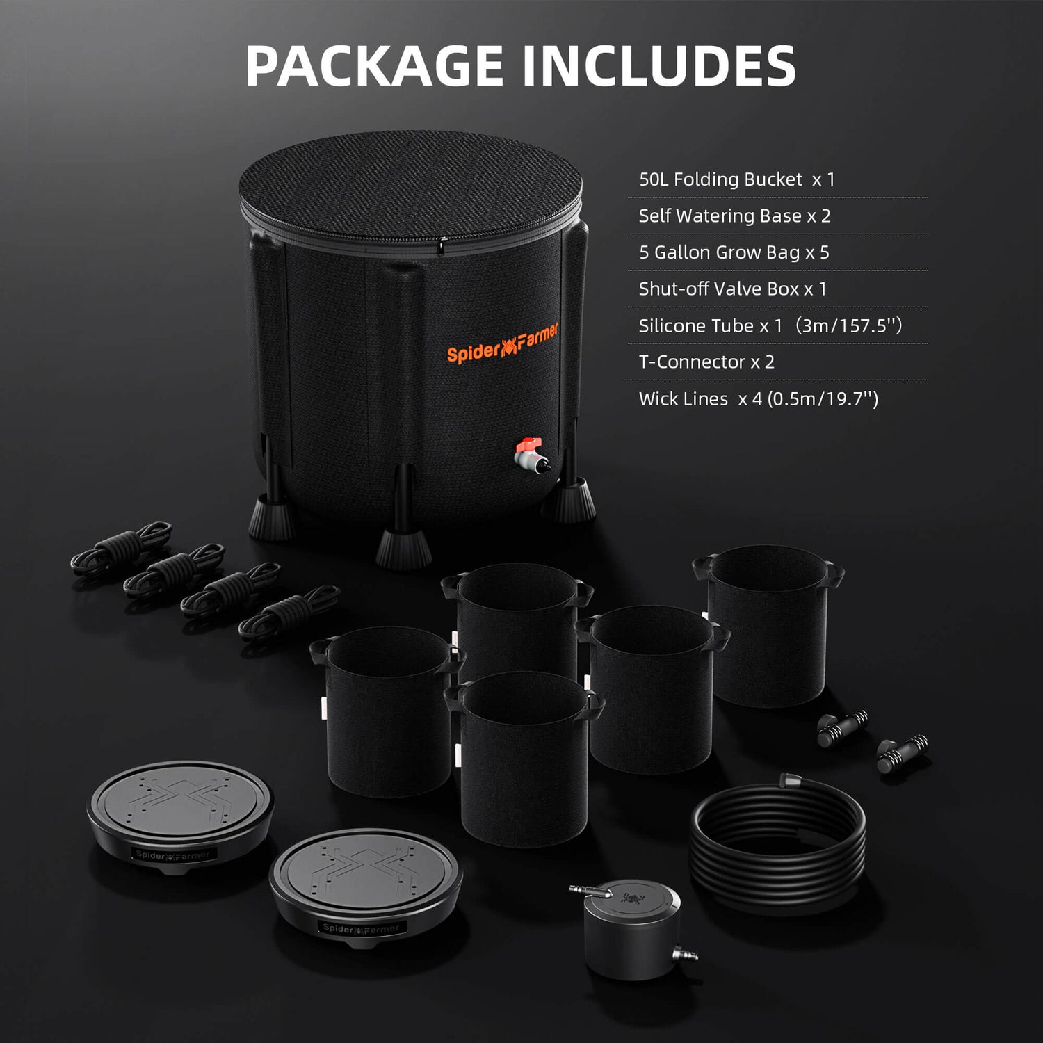 - Komplettes Set: Enthält 2 Selbstbewässerungsbasen, einen 50L faltbaren Wassereimer, 5x 5-Gallonen-Stoff-Grow-Bags, 1 Silikonschlauch (3m), 1 Absperrventil-Box und eine Bedienungsanleitung.